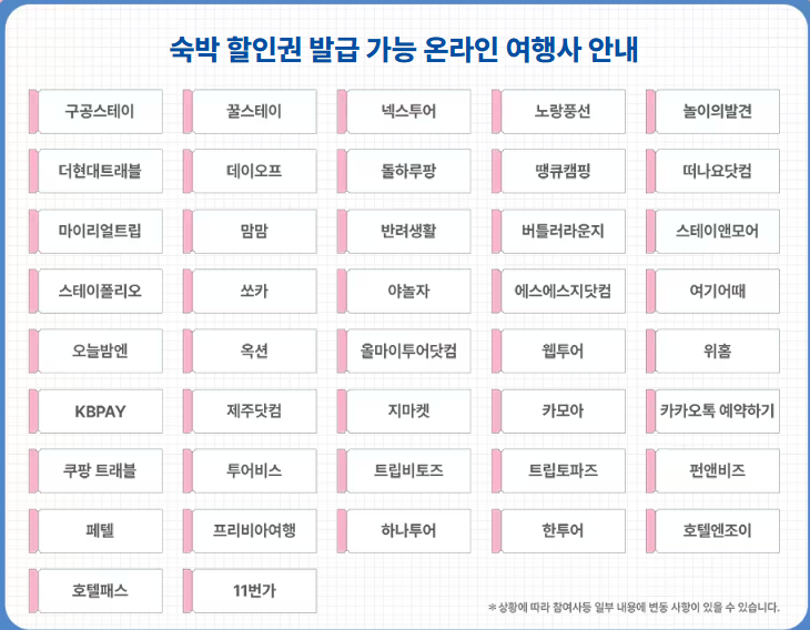- 예약 방법: 온라인 여행사 접속 → 사전 인증 → 선착순 쿠폰 발급 → 숙소 예약